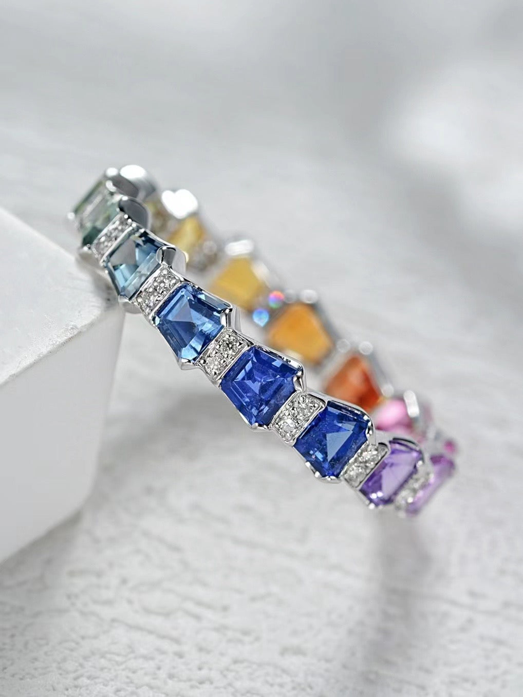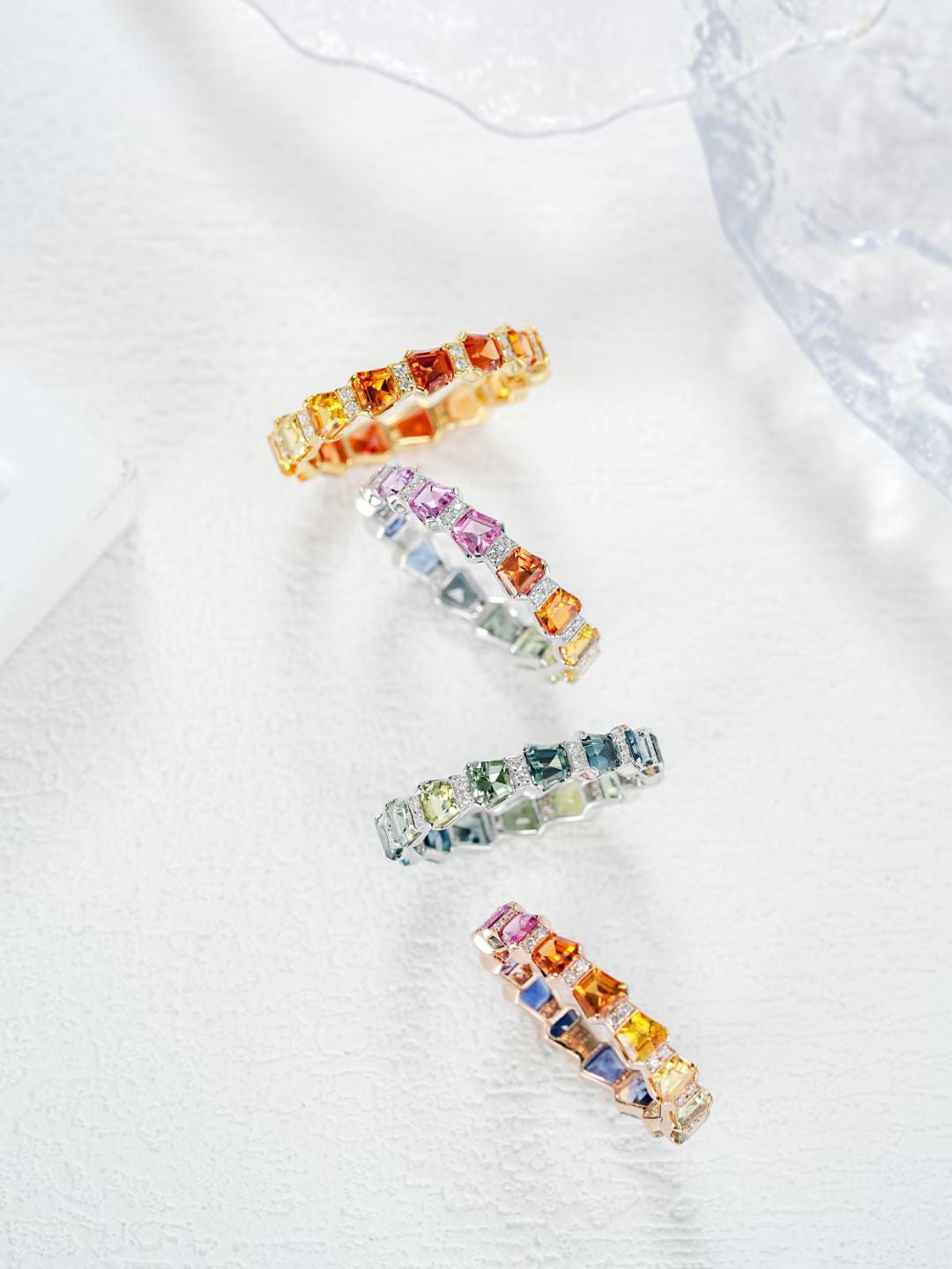 A vibrant ring from our Rainbow Collection, inspired by the beautiful colours of a natural rainbow. With sapphires in a stunning spectrum of hues, set alongside brilliant-cut diamonds in warm 18ct rose gold, this ring is a true celebration of sapphires’ natural colours. Perfect for those who love bold colours and fine gems.